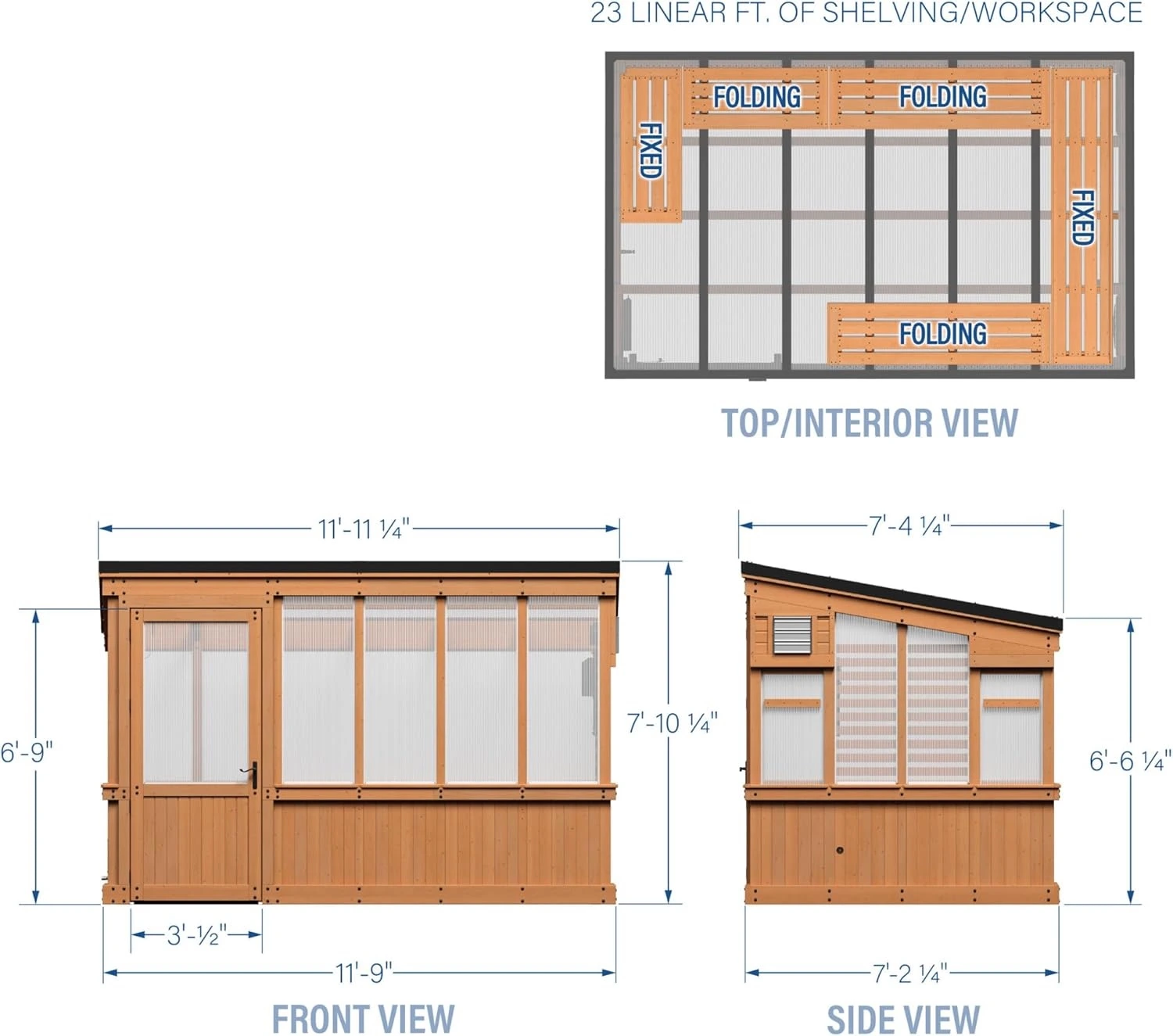- Measurements (L×D×H peak): 11′ 11¼″ × 7′ 4¼″ × 7′ 10¼″